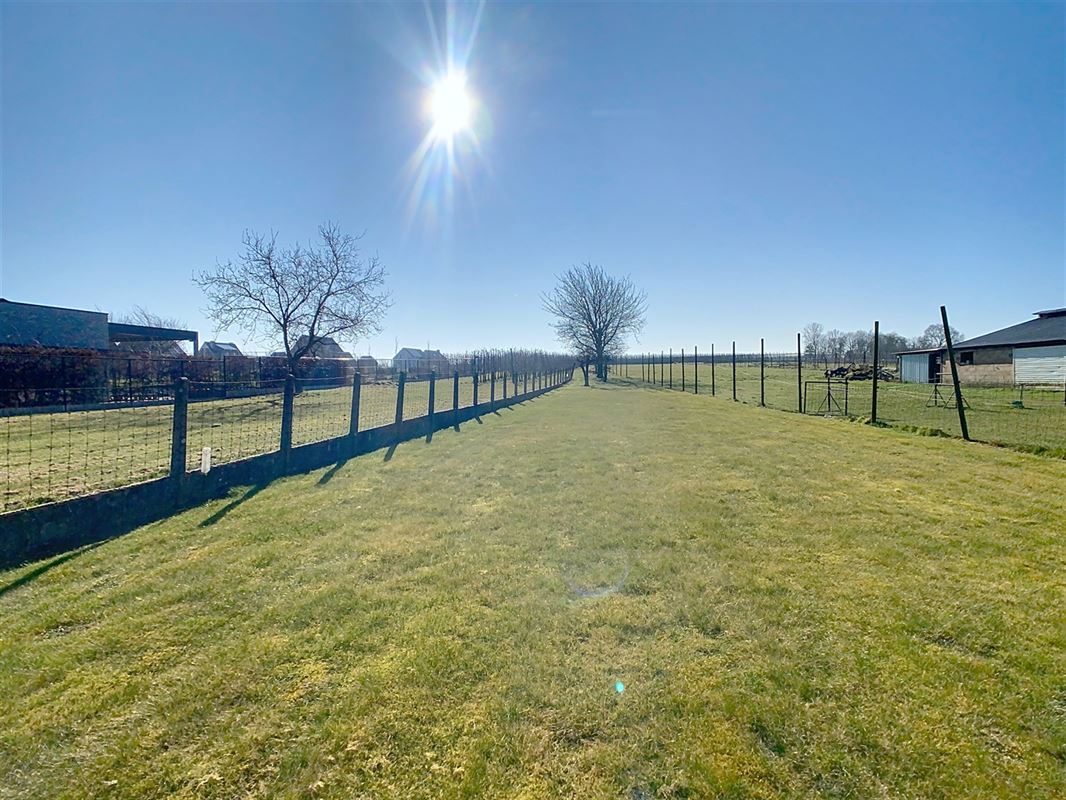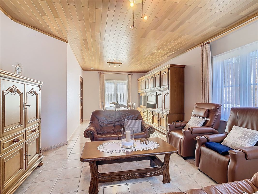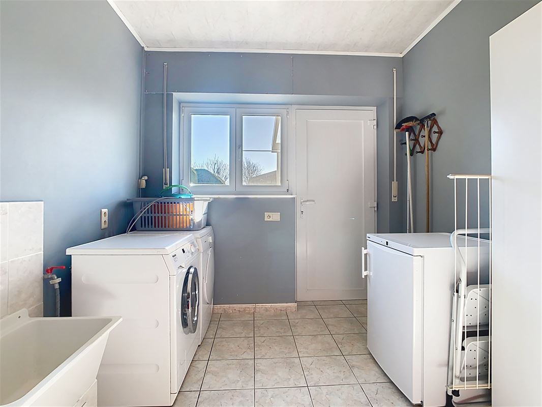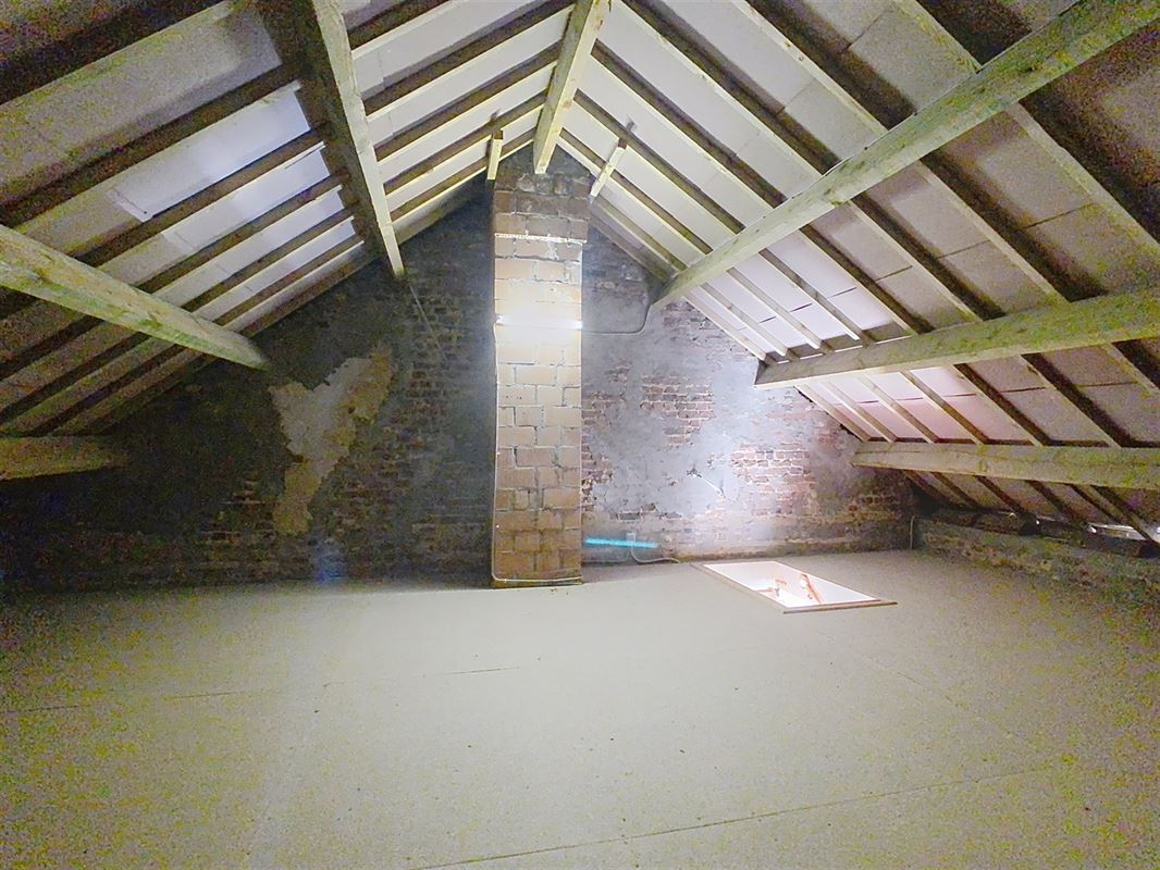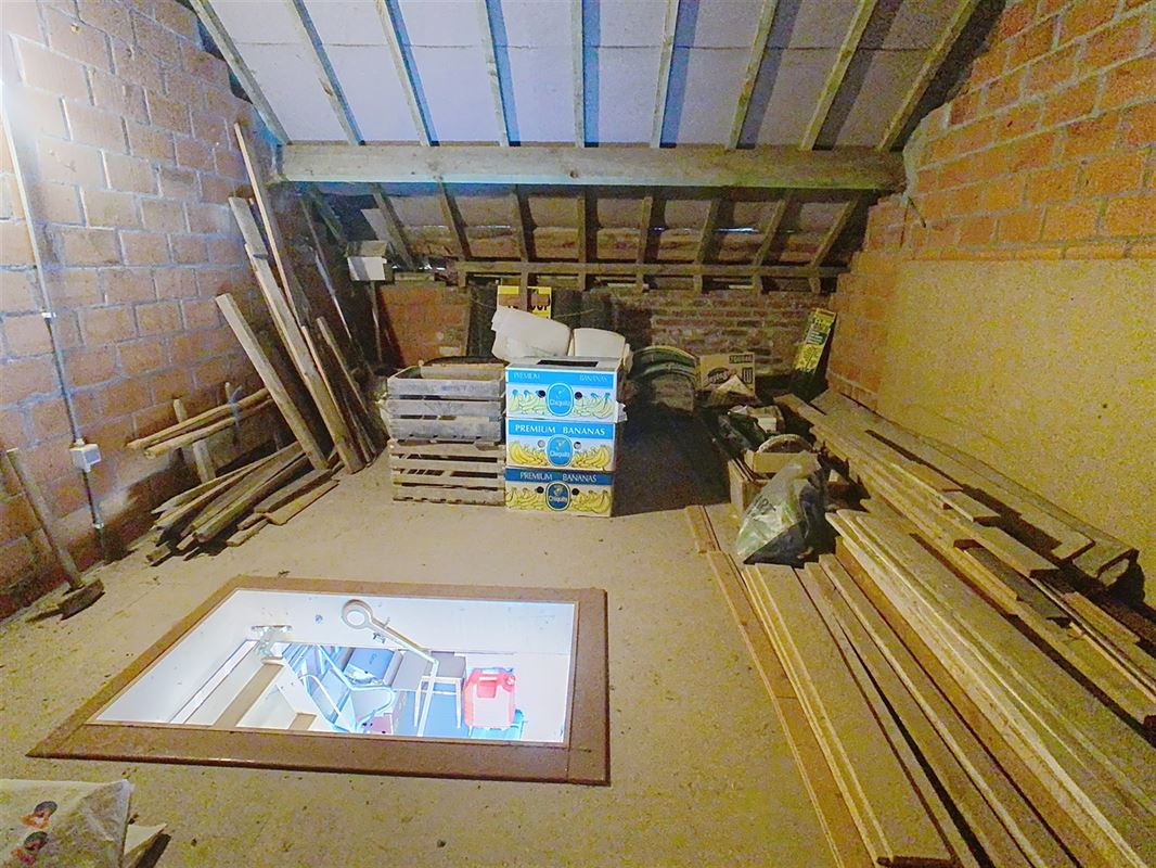 Het overdekt terras en de tuin zijn zowel bereikbaar vanuit de keuken als de wasplaats. Via een trekladder in de wasplaats is er toegang tot een grote zolder van ca. 81 m², die na afwerking de mogelijkheid biedt om twee extra kamers te creëren. De woning beschikt over een garage van ca. 23,9 m² met een zolderruimte van dezelfde oppervlakte, ideaal voor extra opslagruimte. Rechts van de woning bevindt zich een praktische oprit met ruimte voor meerdere parkeerplaatsen.