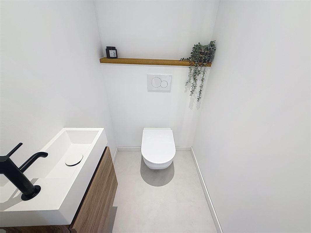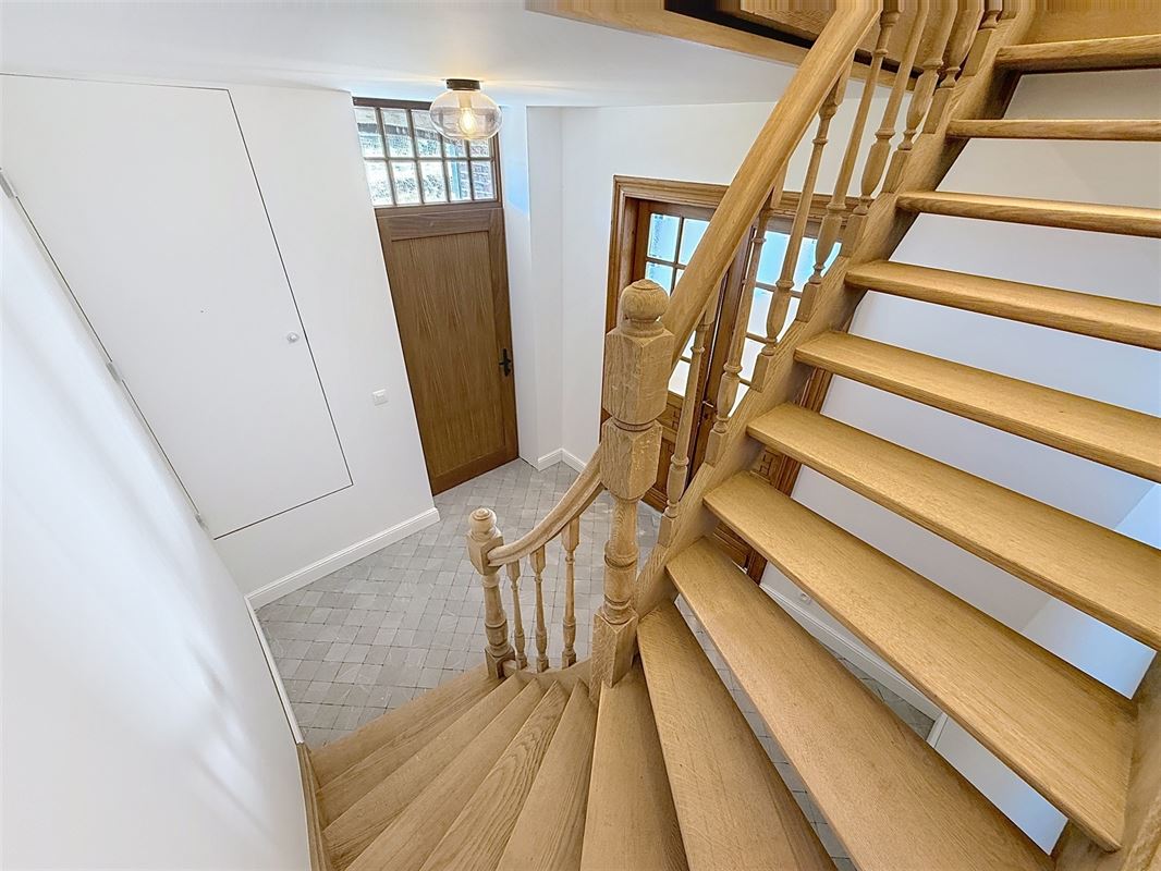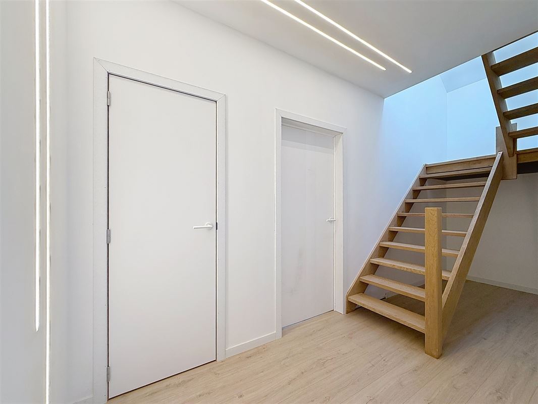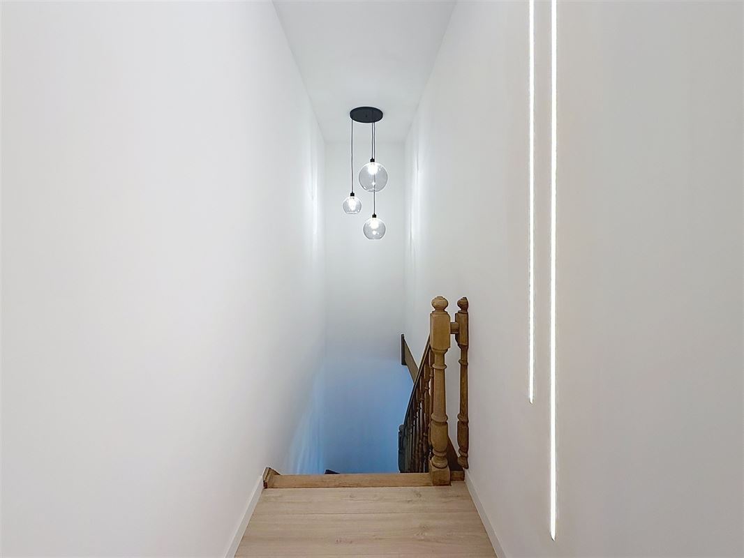 Het gelijkvloers omvat een inkomhal met mooie houten trap, een lichtrijke zithoek met aansluitende eetplaats en een volledig ingerichte keuken met kookeiland. De keuken is voorzien van hoogwaardige AEG-toestellen: twee koelkasten, ingebouwd koffiemachine, combi-stoomoven, combi-microgolfoven, vaatwasser en inductiekookplaat met geïntegreerde afzuiging. Alle ruimtes op dit niveau staan met elkaar in verbinding, wat zorgt voor een ruimtelijk en huiselijk gevoel. Verder zijn er een ruime leefruimte met zicht op de binnenkoer, een wasplaats, een gastentoilet met lavabo en een technische ruimte.